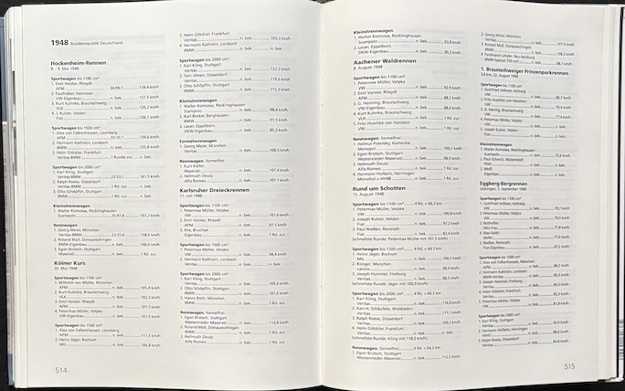 But, first things first: don’t confuse this book with a very similar-sounding one by the same author in 1992, Motorsport in Deutschland 1945–1955 (ISBN 9783613014138). Schumann devotes quite a bit of space in his Preface to explaining that the 1992 book as published was not the book as written. In other words, his then publisher, concerned with the question of marketability and sales, imposed changes in the level of magnification over which the author had no control—the printed book turned out less thorough, less detailed, less everything than Schumann’s original manuscript had been. Even the catch-all title “Motorsport” was unsatisfactory as it gave no clue if both two- and four-wheeled activities would be considered and, without fail, readers who had hoped for motorcycle coverage were disappointed—and vocal!—about not finding any. Nor was there much data on German cars and drivers in races outside of Germany or of activities in the former East Germany.
