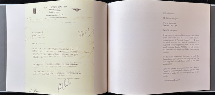 So now the stage is set, and the story unfolds as circumstances cause the discovery of documents unveiling the commissioning of a Batmobile for Batman to be erected on a Phantom IV chassis! It sort of fits that something as enigmatic as a Batmobile would be based on such a grandly conceived car like the Phantom IV—something created to be absolutely superlative; literally fit for a king. The book shows correspondence, replete with appropriate letterheads and signatures, and, helpfully, even offers a typeset version on each facing page in case the original typing has faded too much to be legible.
