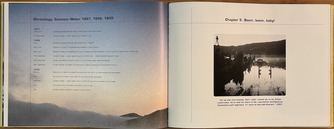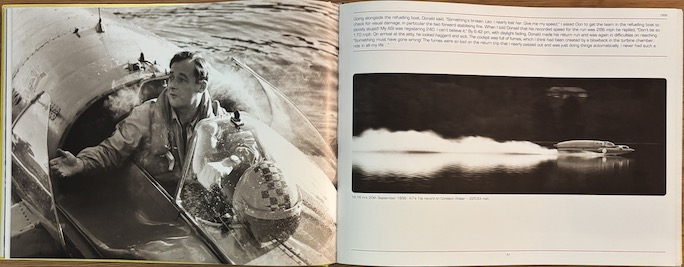 Swiss-based British filmmaker De Lara acquired 30 boxes of Villa’s 3D photos in the course of research for two documentaries he is making about the Campbells. Desmond, a friend, is a powerboat historian who had already worked with Villa in the 1970s on two of his books. Poignantly, the book was launched on what would have been DMC’s 86th birthday, on 23 March 2007, at the Ruskin Museum in Coniston, Cumbria. Coniston Water was the stage for several of both Campbells record attempts and the site of DMC’s fatal crash in K7 at a speed in excess of 300 mph (480 km/h) in 1967. The boat, and a few weeks later his body, were not raised until 2001.