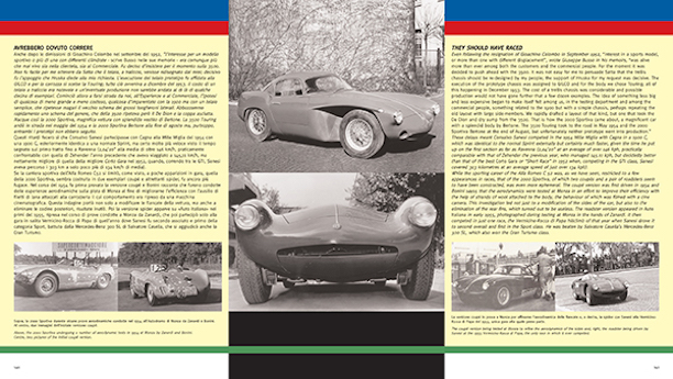 This book brings together all the great moments of the dramatic races, partly run in appaling condition. Interspersed are some chapters on cars constructed by Alfa Romeo but then not run in the Mille. The text is bilingual, on opposite pages; the captions are very detailed and informative. Curami has had access to the Alfa Romeo archive and the Novaphoto/Sorlini photo collection. Wonderful period photos (some even in color) illustrate not only the works entries but also the vast number of private Guilliettas. The introdcution to each year also reproduces the respective Mille Miglia poster and a road map which is in most cases so small as to be barley legible. The layout is fresh and the design colorful. At the back is a table listing the overall wins, class wins, start numbers, and date and distance of each race. (It only lists the winners but not all starters in Alfas)