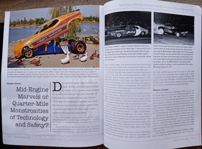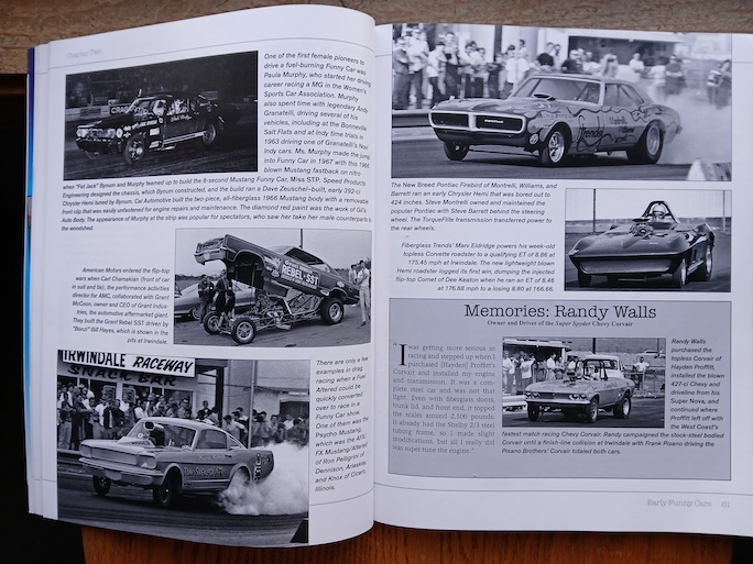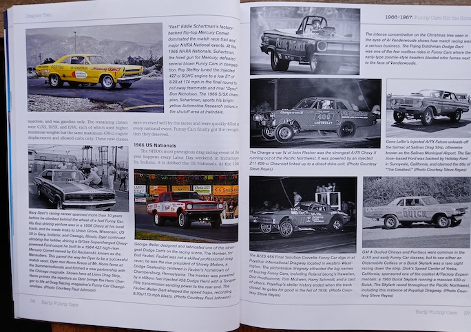 Hart also includes twenty-something sidebars that are first-person memories of others active in the funny car drag world. Too, notice those photo captions on the sample pages shown here. They don’t merely repeat sentences from the text, but rather add to and augment information for readers.
