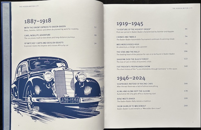 The book can be thought of as a yearbook, 1887 to 2024, presenting stand-alone entries, often in the form of newspaper excerpts, in chronological order, often with commentary. Stick with it and read enough of them—and/or take in the smartly designed Table of Contents—and you will indeed come to appreciate that Baden-Baden does have a place in automotive history and also on the automotive calendar still today as a hub or waypoint for motoring events from concours to rallies. In other words, the subtitle is not hyperbole, but that Gullwing on the cover is quite the red herring because there is no relevant connection other than the 300 SL (and 190) club having had several annual gatherings here.