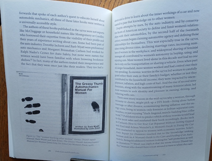 Image is of the front and back cover of a real and inexpensively produced book educating women on the inner workings of automobiles. Published in 1976 it “stands out as unexpectedly successful . . . it went through six printings” and “in 1985 . . . was still being reviewed and mentioned as a ‘classic’.”