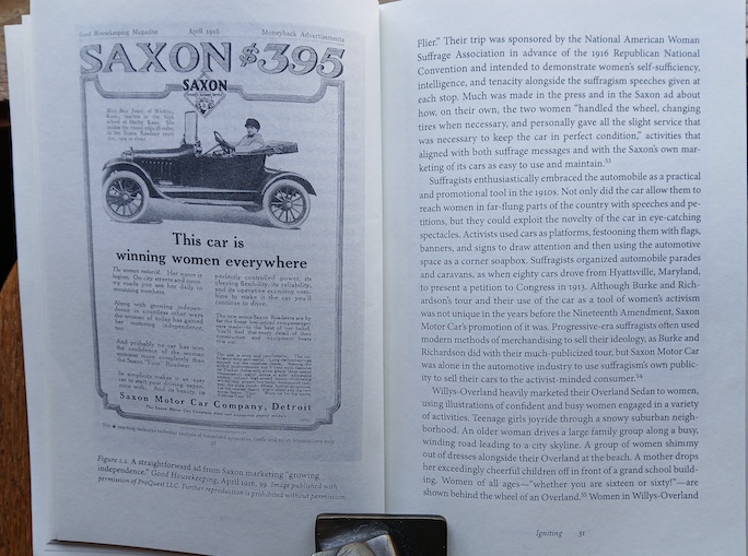 You wouldn’t be far off if you observed that some things done in the name of progress actually are backwards progress. Such a situation is described as this book begins with Jessica Brockmole, its author, observing “In the first two decades of the twentieth century automotive companies advertised to women.” She cites details and gives examples including a listing of those manufacturers and the magazines in which they placed ads. One of those ads is shown below.