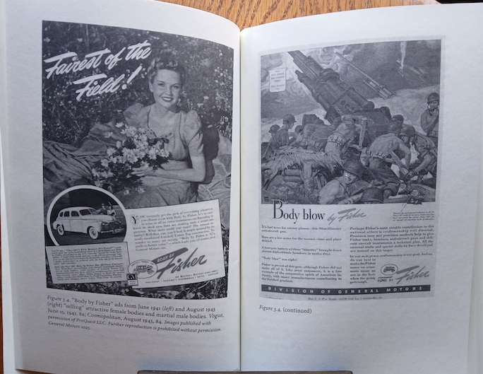 The author’s analysis of these two wartime ads from the Fisher Body division of General Motors includes a comment they were “ ‘selling’ attractive female bodies and martial male bodies” during this time when cars weren’t being produced, thus not sold.