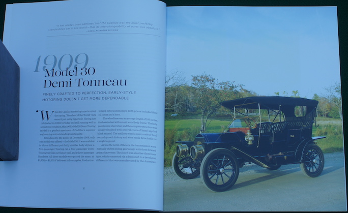 The format is essentially a series of 26 vignettes that begin with a short description of the selected car’s technical features followed by that car’s history as related by its owner and/or family members. Regrettably there is no Table of Contents (nor Index) but the cars are presented chronologically, ranging from a 1909 Cadillac Model 30 Demi Tonneau (above) to a 1993 Cadillac Allanté (here deprived consistently of the accent mark) convertible coupe.