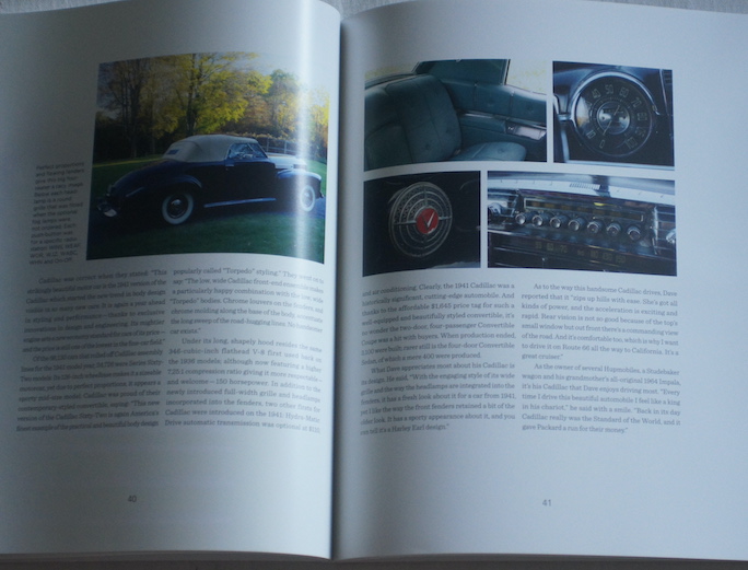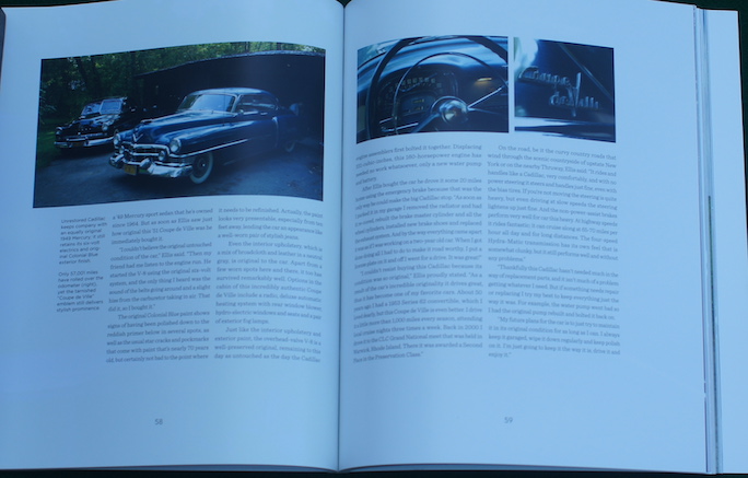 The vignettes typically start out with a short introductory page of text flanked by a full-page color photo, usually a full-view portrait of the car being described, but not always, and then two more pages of brief text and additional color photos. Several receive a six-page treatment, while the 1984 Cadillac Eldorado Biarritz, a modern classic if ever there was one, gets short shrift with only two pages of coverage. Unfortunately, it is in the photos where things get weak. The heavy art paper used reproduces color very well but many of the detail photos are small. Very small. And rather dark. In fact, a large percentage of photos, regardless of size, is so dark as to obscure details, especially in the unnecessarily too small detail shots. This gives the presentation an overall gloomy cast especially so for cars in a darker color scheme.