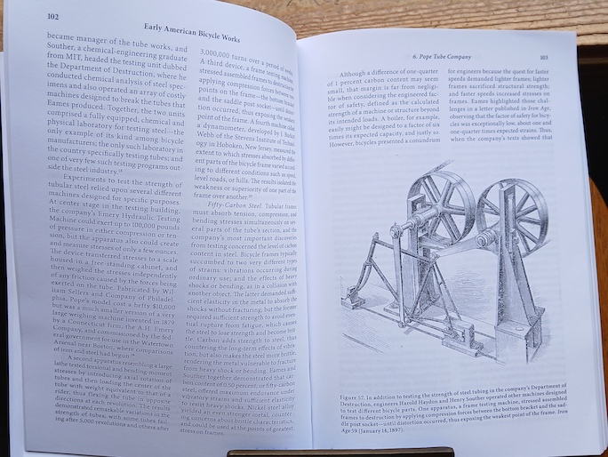 This device tests the strength of a bike’s steel tube frame “by applying compression between the bottom bracket and the saddle post socket—until distortion occurred, thus exposing the weakest point of the frame.”