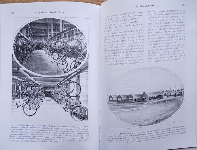 Workers commuted by pedaling. Factory owners constructed sheds in which they could park their bikes. Each devised ingenious methods of best utilizing the space. Right-hand page shows exterior of American Rolling Mill bike sheds. Top left is Underwood Typewriter Company interior, bottom is that of Hartford Cycle Company.