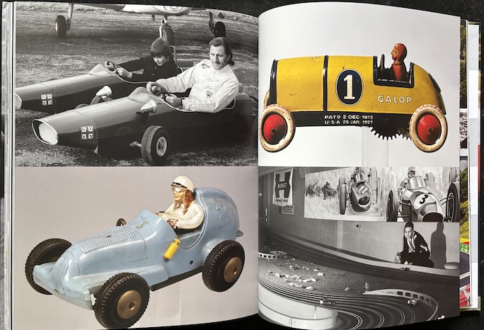 If you know your stuff you’ll recognize the race cars, yes? Clue: on the hood of the no. 14 car is a partially visible stencil: “Thin W__”. Open, the book is 18″ wide, large enough to reveal such detail, if you take the time to look for it.