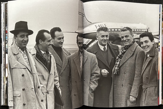 An entirely un-obvious shot to put into this sort of book. The caption tells us that Trintignant, Behra, and Rosier are in this 1954 photo, en route to Argentina. Big names. But which of the seven men are they?