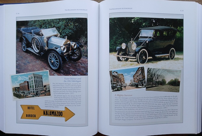 An effective approach and use of the 32-page color insert pairs the photo of a made in Kalamazoo vehicle, in this case Michigan Motor Car-made Michigans, that are part of the Gilmore Car Museum collection with area period postcard images.