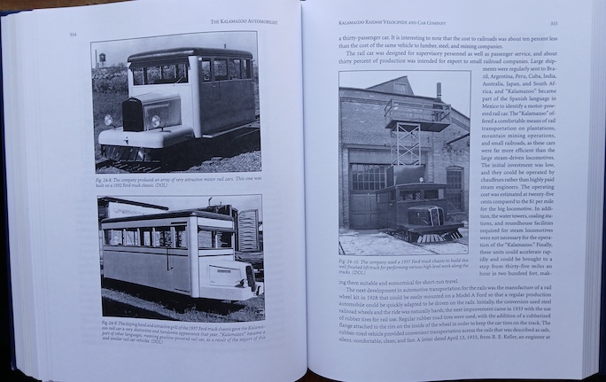 In addition to the cars and trucks made in Kalamazoo were rail-going cars of the Kalamazoo Railway Supply Company. Those shown here utilize Ford-built chassis and engines.