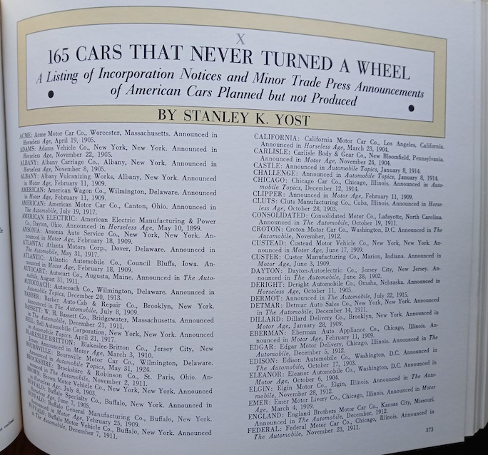 The most pages, just shy of 150, are devoted to listing the 5000 marques and are not limited to gasoline-powered vehicles but integrate steam- and electric-powered ones as well just as they were and have been intertwined throughout history. There is even a chapter devoted to the companies that had engaged in some stage of developing or announcing a motorcar intended to be built but that “Never Turned a Wheel.”