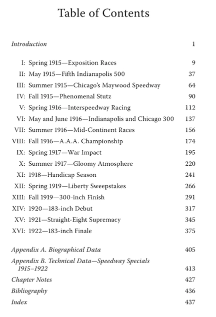 To his credit, Dick manages to handle the technical and the practical, including some of that which includes the various personalities of the era. Indeed, Dick has compiled one of the very best bibliographic listings of participants from this era that you will find. Calling it “impressive” is definitely warranted. And, being an engineer, Dick has an appendix dedicated to the “Speedway Specials of 1915–1922” which presents the usual nuts and bolts stuff but also good background on the various cars.