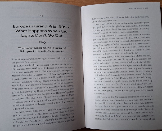 The book isn’t meant to be the last word on Formula One but for newcomers to the sport it’s an endearingly readable first word, written by a young author whose enthusiasm seasons the text. A book spanning three quarters of a century of Formula One risks being superficial, and it’s also a challenge to avoid condescending to its readership. That it has succeeded in navigating around both risks is to Alex Jacques’ credit. I bet he’s already planning the next edition for 2050, working title 100 Milestone Moments. There’s plenty of time to reserve the services of a more diligent copy editor.