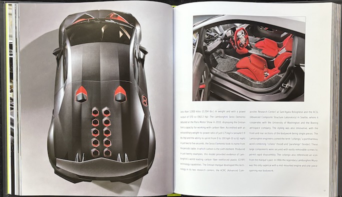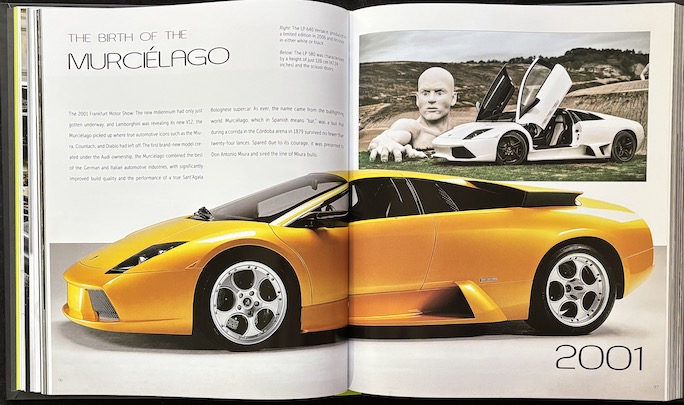 The car photos are pretty spectacular in terms of selection and technique (after all they are Lamborghini’s own) but so is their reproduction in print and their arrangement on the page.