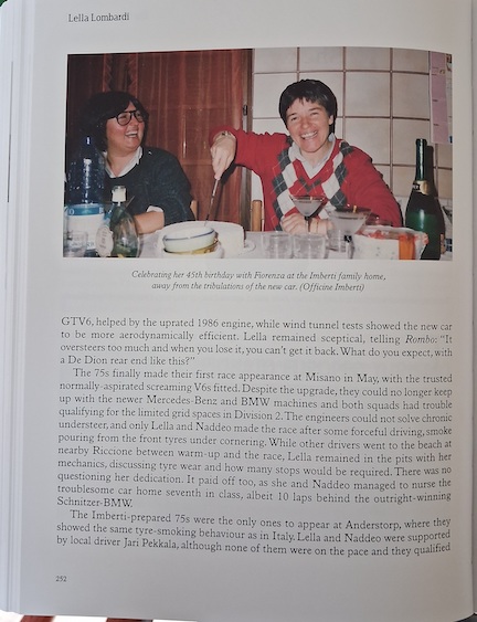 As for sexual orientation, it simply wasn’t talked about. Lella was openly gay, in a long-term relationship with her partner Fiorenza [1], who often accompanied her to races. Like my fellow enthusiasts of the time, I neither knew nor cared about her private life, those being the simpler times when even an F1 driver had such a luxury. In his recent book Alex Jacques referred to the fact that Lella was a member of the LGBTQ+ community, apparently unaware that such a community didn’t even exist at the time. No fault of Gen Y Alex, but it epitomizes how poor a fit modern societal norms can be on past times. The author writes about Lella’s private life because it’s part of her story but he takes care to ensure that it doesn’t, and shouldn’t, define her.