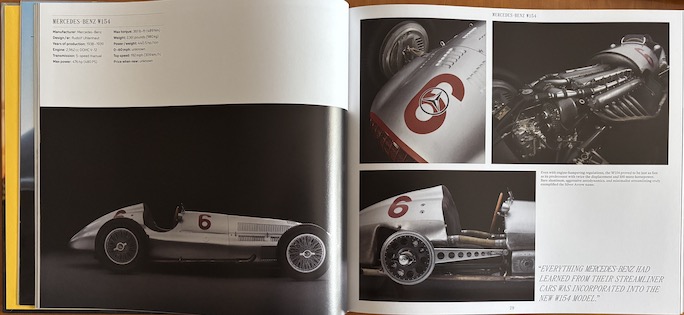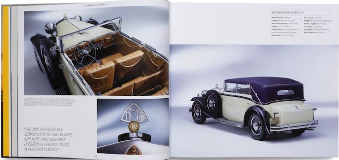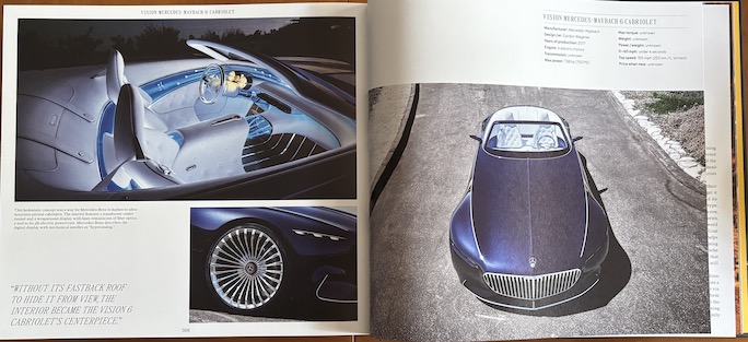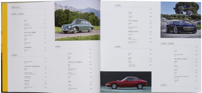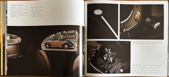 The book is divided into six eras, each introduced with an essay-type overview of what’s happening in design, culture, and technology. Specific models are then presented, on several pages each, and in no discernible order (which is of no practical consequence in this type of book). The first car is the 1935–39 Horch 853, the newest the 2019–present Porsche Taycan.