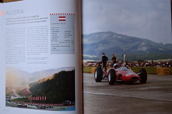 How the publisher has managed to produce such a classy-feeling book for less than the price of a couple of paperbacks escapes me. It is a well-designed, 256-page hardback with a wealth of illustrations. And good though the sparely written prose is, and however informative the circuit diagrams are, the pictures elevate the book to a level I really didn’t expect. Look, I’m a words guy, I cling to the credo that 500 well-crafted words are worth any number of pictures, but the illustrations alone make this book an excellent buy. I’ve long grown tired of close-cropped shots of race cars and drivers that convey nothing of the sense of occasion and drama of a Grand Prix. But the choice of pictures here is simply brilliant. Such as the shot of Lance Stroll at his home race, taken from the perspective of a grandstand seat at Montreal in 2022 (above). Or Lorenzo Bandini’s Ferrari at a moody Zeltweg, Max Verstappen waving to his home crowd, barely visible through an ecstasy of orange flare smoke and the moody b/w shot of Dan Gurney taking the checkered flag at Rouen–Les-Essarts in 1964. Pictures like these can only be chosen by someone who understands that the theater of Grand Prix racing transcends mere stats and tiresome GOAT lists. Chapeau, Bruce Jones.
