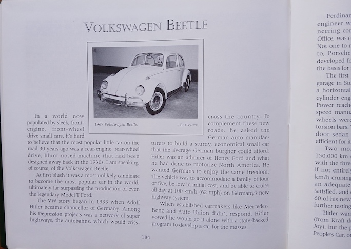 Vance (1935–2022) was a Canadian government employee with an intense interest in automotive history and technology. That interest led to his sharing, as his own knowledge increased, via writings that became newspaper and magazine columns, as well as articles in consumer, trade, and technical publications. His fascination with the subject—social and engineering aspects alike—led to earning him such respect from his fellow automotive journalists that he became one of but three Canadian writers chosen to serve as a juror on the Amsterdam-based 2000 International Car of the Century committee. Amongst their finalists and a runner-up was “the closest to a world car that has so far been produced,” the Volkswagen Beetle.