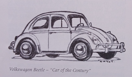 Telling Volkswagen’s story and that of its Beetle is one of the 61 chapters in Volume I. The pencil sketch below appears elsewhere in this volume, attributed to Hugh McCall.