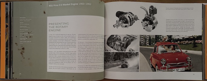 Clever graphic design. Left page—that’s not smudges in the paper but a close-up of rust on the body of the model that introduced “a completely new engine concept” to the world, the Wankel.