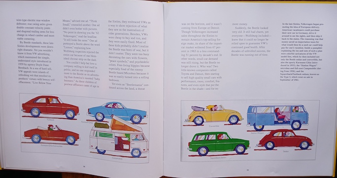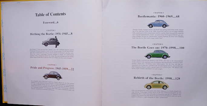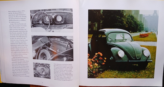 This book tells the Beetle’s story up to 1998—but not beyond—and does so delightfully in words illustrated with big, bold images and smaller detail ones too. Overall it captivates the charm the Beetle itself exuded—and for those fortunate enough to own one today, still does.