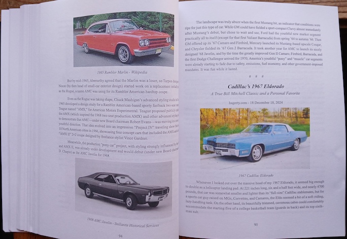Left page illustrates ”How Chrysler and AMC Countered Ford’s Mustang.” Facing page is the ’67 Eldorado Witzenburg owned for a time, describing it as “a personal favorite.”