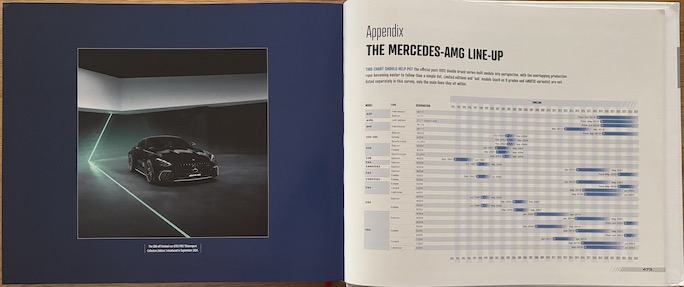 A key fact to be aware of is that the book is organized around Calendar Year order because most of the world uses the same Gregorian calendar whereas Model Year is subject to all sorts of arbitrariness such as launches in different markets. There is an Index but it doesn’t list AMG models, nor does the Table of Contents (which would not really be practical) so the one sure path is to find a model in the 4-page “timeline” table in the Appendix (below), ascertain the relevant year/s, and return to the TOC to find what page/s that year’s coverage starts: