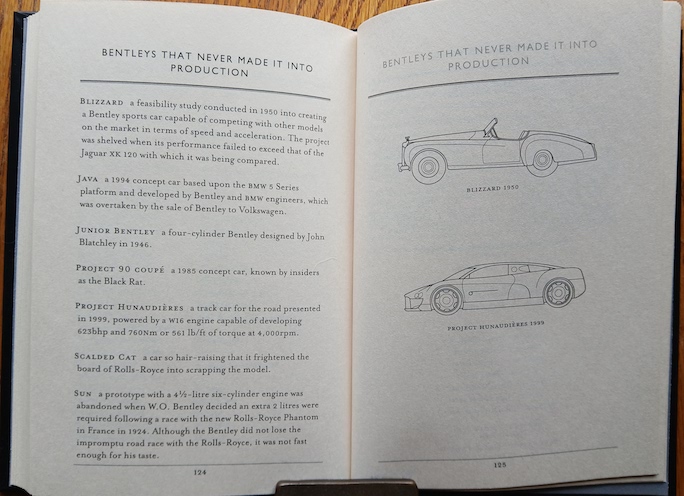 Next come the three full pages comprising the Table of Contents. Among the list is one for the production figures of Bentleys 1919 to 2004, another telling a bit about “Bentleys that never made it into production” (above). Illustrating that last mentioned, as well as a number of other pages throughout the book, are beautifully executed little line drawings. All are credited as the work of a Linconshire-based graphics artist named Mark Watkinson whose online portfolio is enormous.