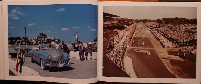 Several of the 1930s years featured more pages than just two as well enabling more to be shown than just the portrait of the pace car. By the beginning of the 1950s color photos start to make their appearance too as seen in this next page pair from 1952 when Studebaker paced the race with its Raymond Loewy-designed Commander. “It was the firm’s centennial year as a producer of vehicles and the golden anniversary of the automotive divisions.”