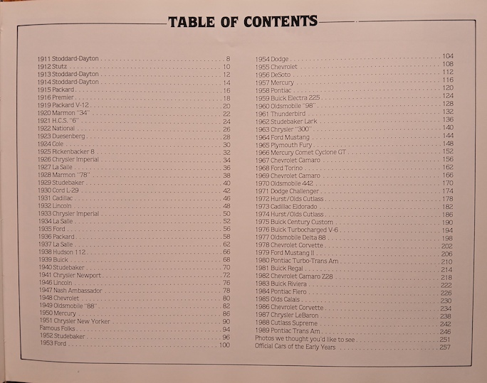Prior to John Aston recently telling you about Rick Shaffer’s It’s… A… New Track Record!  there have been only two really reliable Indy 500 references. One is The Indianapolis 500 Chronicle. This book is the other one. As is true of Chronicle, even with the publication of Shaffer’s book, this one remains a seminal Indy 500 reference in that Shaffer’s book covers just the single 1962–1972 decade while, as you can see from this book’s Table of Contents (below), it presents all pace cars 1911 through 1989.