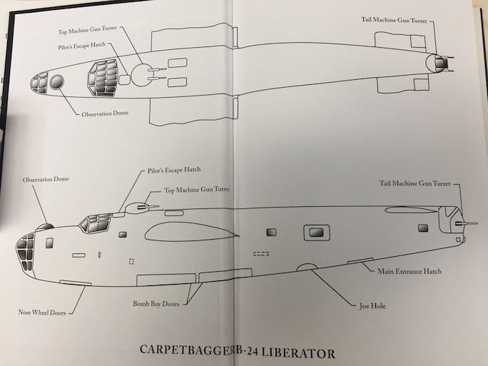 At its height, the Carpetbaggers consisted of four squadrons, each with sixteen to nineteen Consolidated-built B-24 Liberator aircraft, thus approaching 3,000 men and around 75 aircraft. Each Carpetbagger B-24 was repainted all black. Other modifications included removing oxygen equipment and the waist gunner position in order to be able to carry more cargo. The belly turret was replaced with a “joe” hole from which a person could parachute for not only did Carpetbagger missions carry supplies from Britain into France to support the resistance fighters but also specially trained people—Joes and Josephines as the secret agents were called—to assist the French partisans.