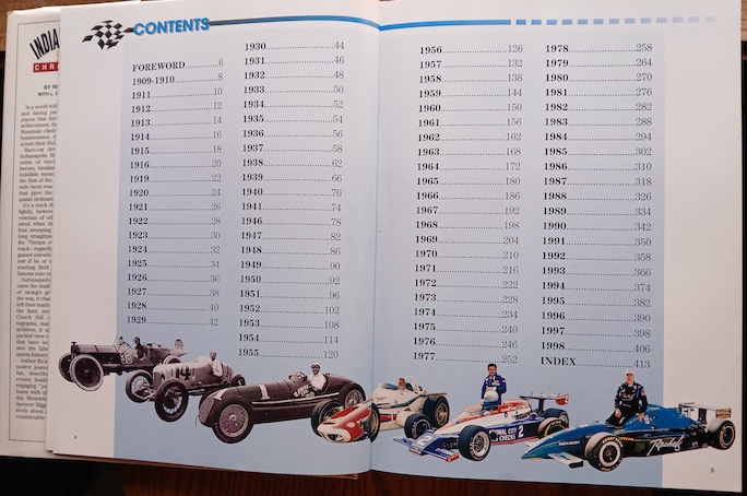Popely’s Indianapolis 500 Chronicle covers virtually all aspects of each race year-by-year from 1909 to 1998. Each year’s race is presented and covered similarly. As the Table of Contents above indicates, the early years are each covered by a pair of facing pages. But beginning in the 1950s covering each race is given two, three, sometimes four facing page pairs, and that continues to be the case from then on. I picked at random one of the years that utilized three facing pages to show you how a year is typically presented.