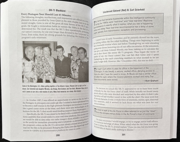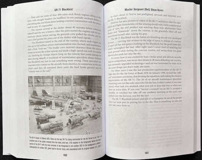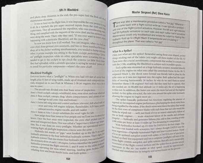 “Written through the eyes and perspective of many Habus who were willing to share their thoughts, emotions, and stories” this book takes you behind closed doors and gives you a direct view of processes and situations—flight line ops, fueling (on the ground and in the air, even dumping fuel) and inerting tanks, the role of the buddy crew, night flying and a hundred other things—that the techno-focused Blackbird books mention in passing at best. Of course the infamous engine unstarts are described here.