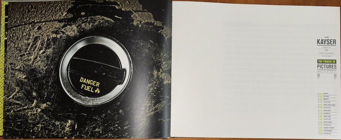 The oversize, landscape-format book (14 x 11”) showcases multiple views of individual cars—some across the entire spread— and sporting events like Laguna Seca or the Tourist Trophy, the latter obviously not about cars, nor, for that matter, motorbikes, but people. In the absence of any sort of commentary or guidance, whatever “stories” Kayser saw in his mind’s eye as he took the photos won’t be the same as the reader’s. In other words, audience participation required.